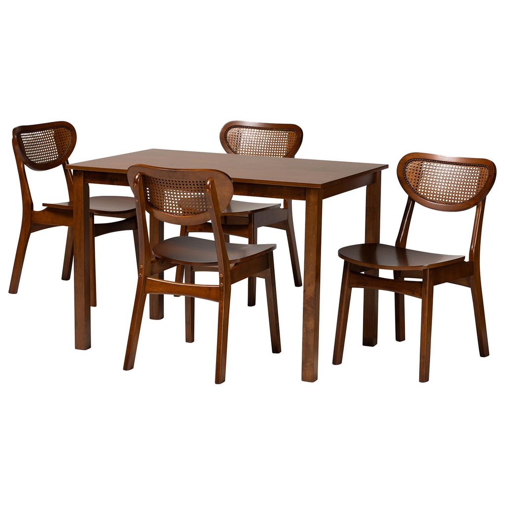 Jeriah Mid-Century Modern Finished Wood and Woven Rattan 5-Piece Dining Set