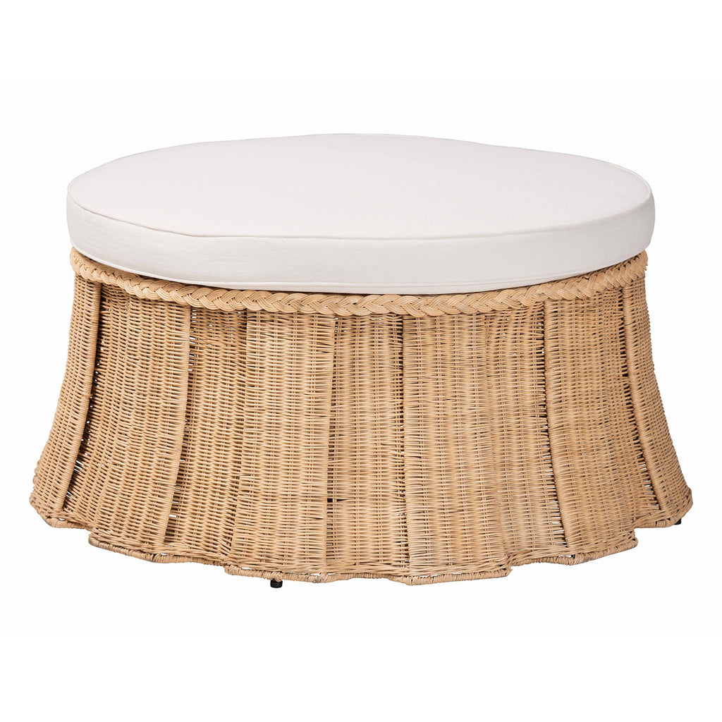 bali & pari Ying Round Rattan Ottoman with Cushion - Handwoven Wicker Pleated Skirt Accent Coffee Table or Extra Seating for Living Room or Sunroom, Large