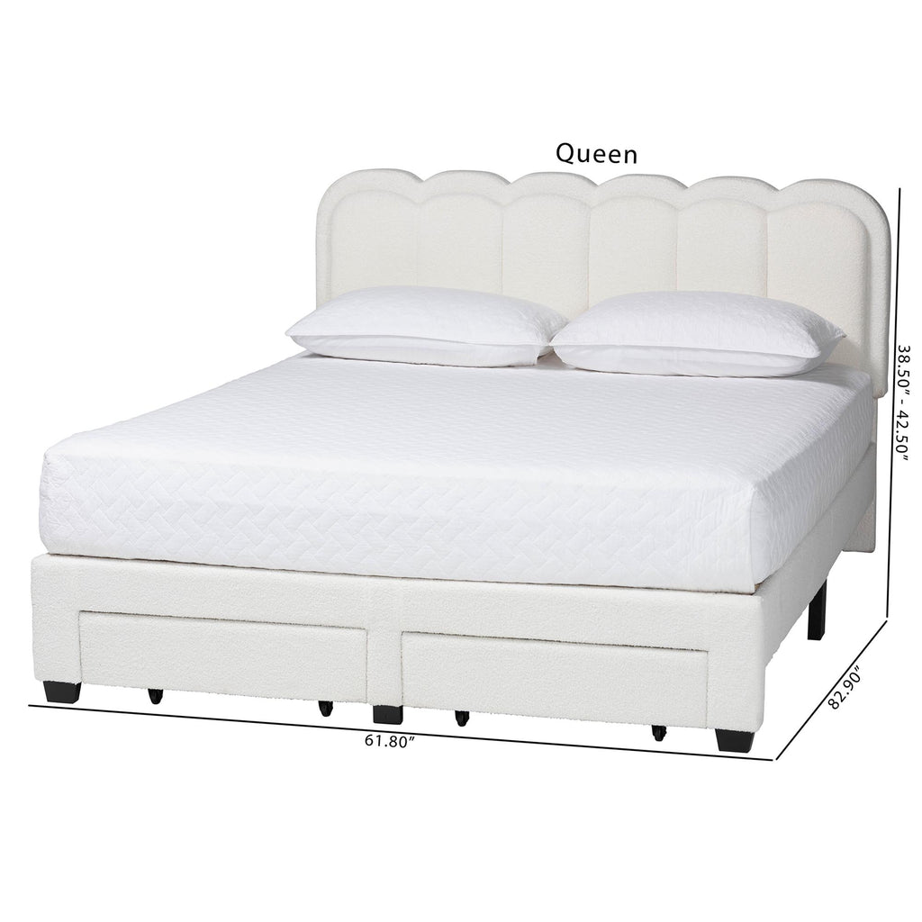 Caradonna Cream Teddy-Bear Fabric Bed with Storage Drawers - Fully Upholstered Platform Bed with Scalloped Headboard,