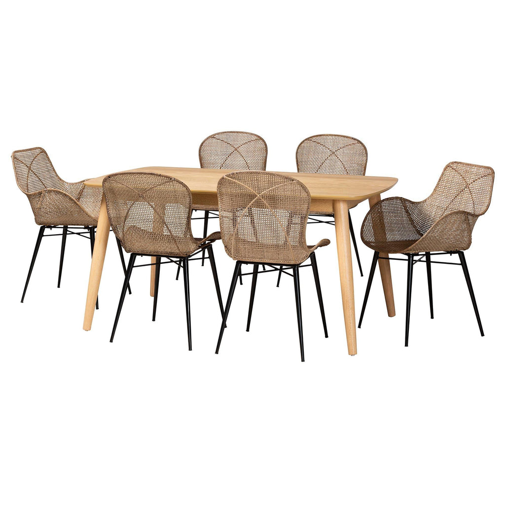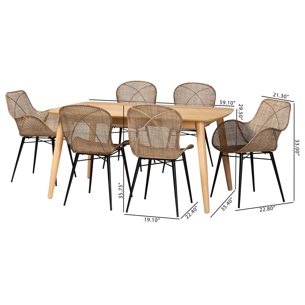 Emmali Modern Bohemian washed Rattan and Finished Wood 7-Piece Dining Set