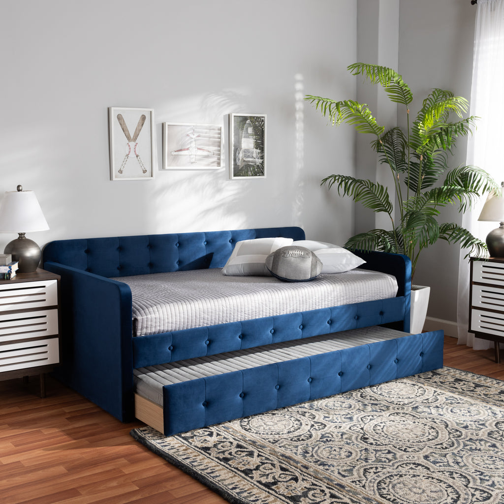 Jona Modern and Contemporary Transitional Velvet Fabric Upholstered and Button Tufted Daybed with Trundle