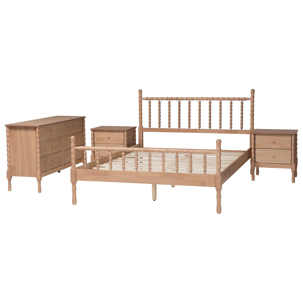 Laurent Bamboo-Style 4-Piece Bedroom Set - Spindle Platform Bed with Matching Dresser and Two Nightstands, Cottage Farmhouse Style,