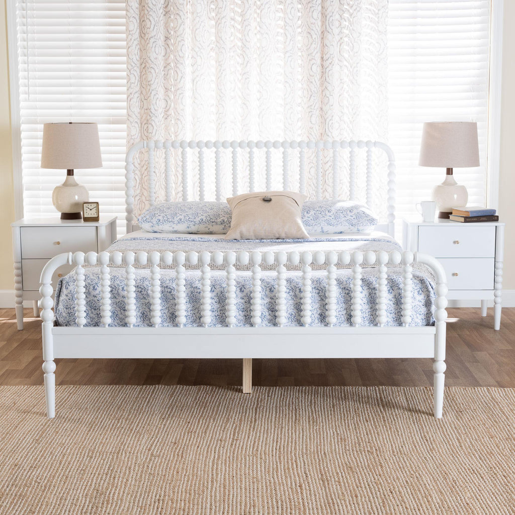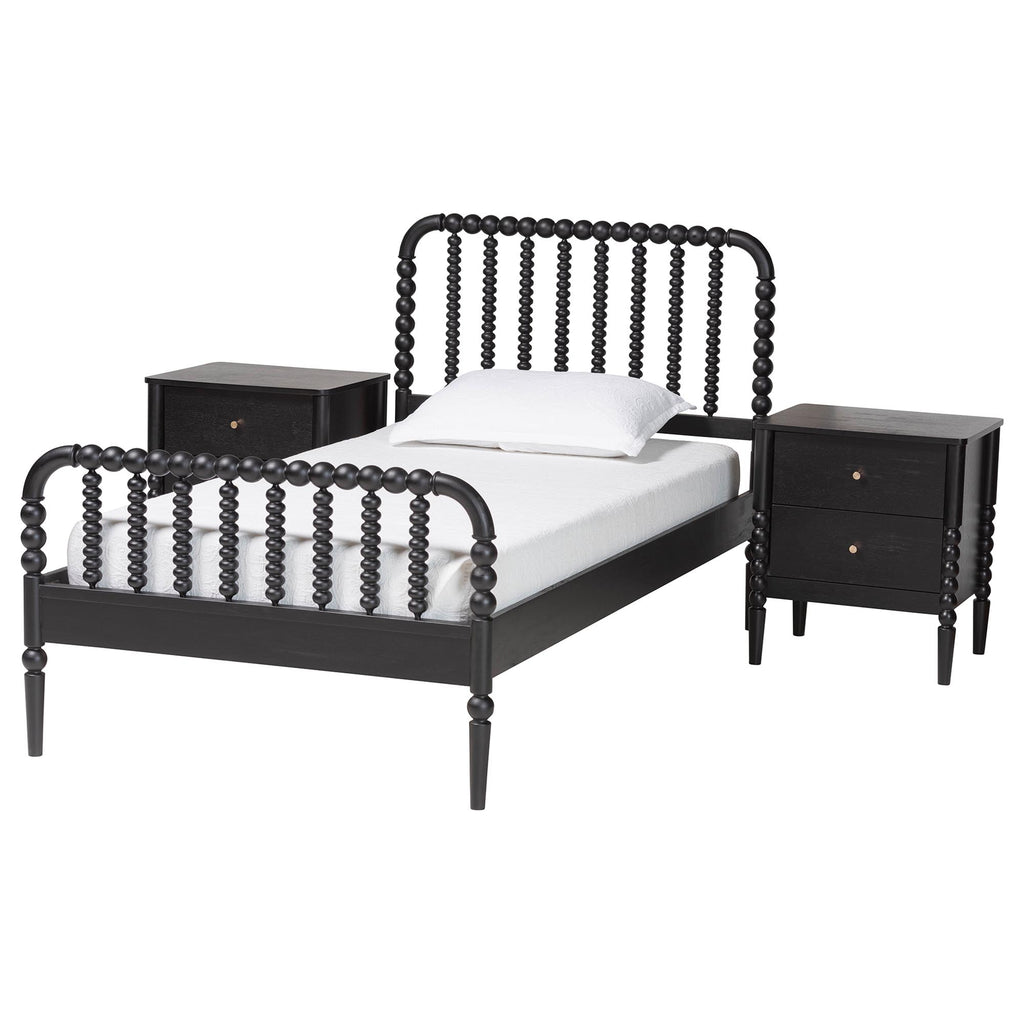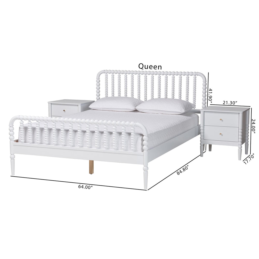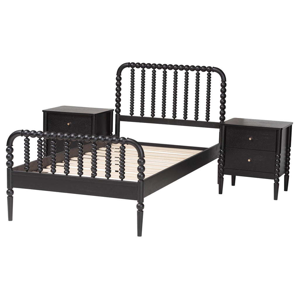 Mid-Century Set Includes One (1) Platform Bed and Two (2) NightstandsConstructed from Rubberwood and Engineered WoodTurned bobbin design rich with traditional charmSlatted wood headboard and accent footboardMinimalist metal drawer pulls add a glamorous touchNo Box Spring Required: Wood slats eliminate the need for a box springAssembly Required?: