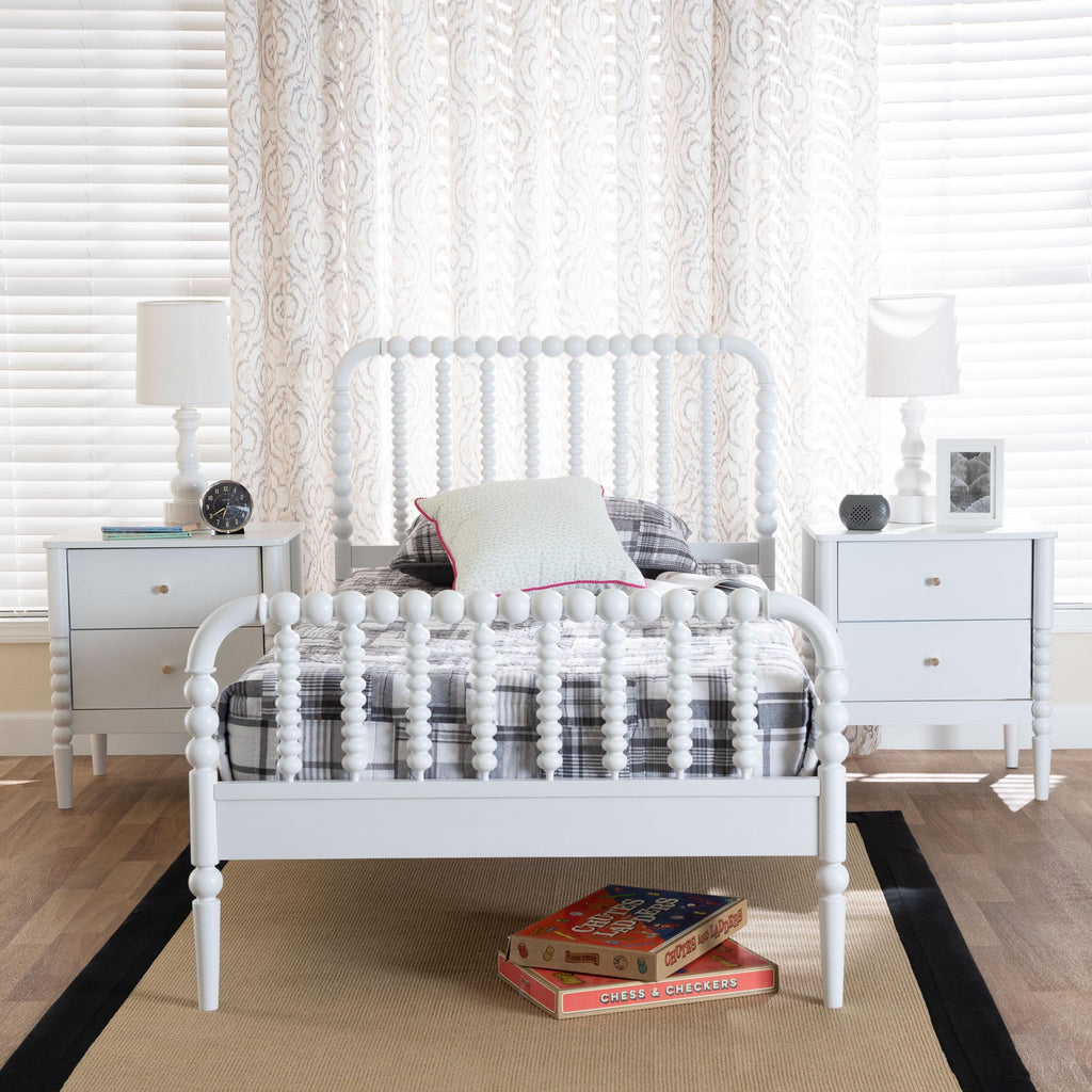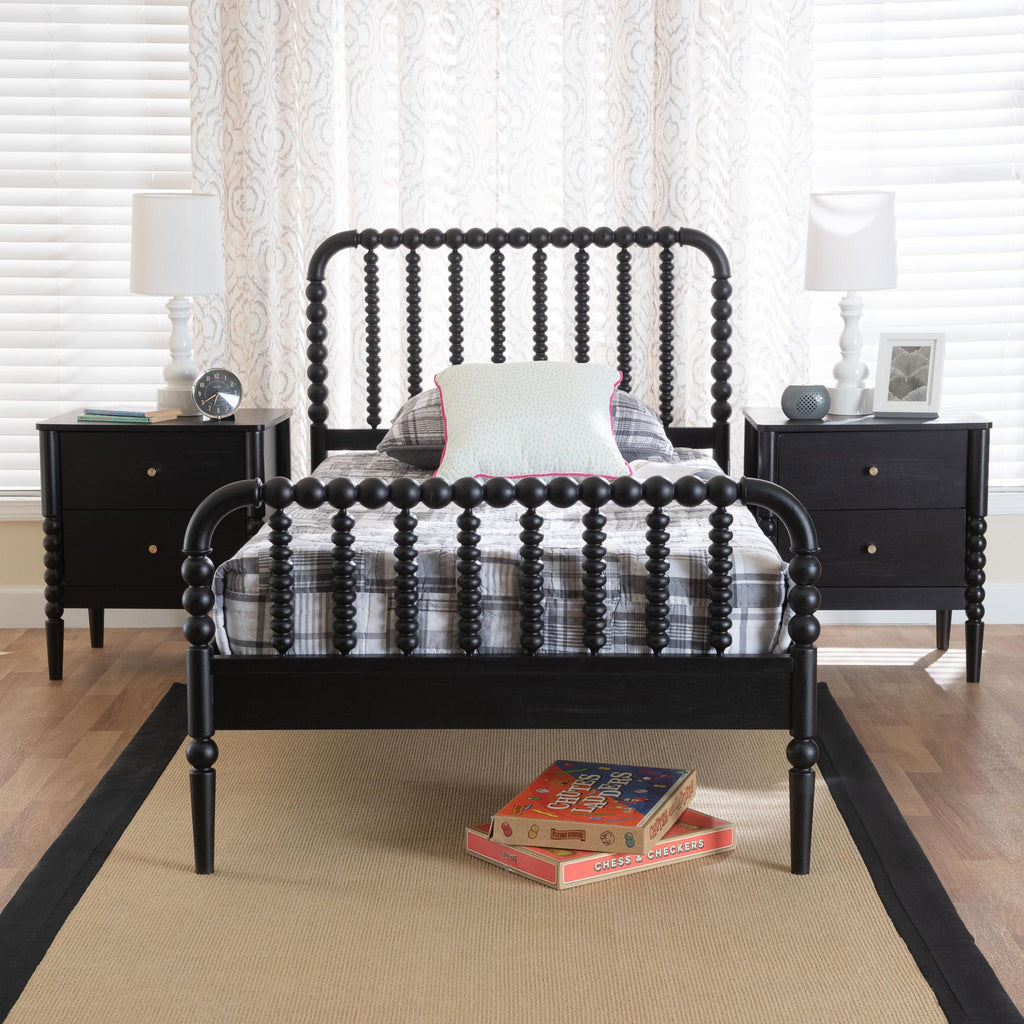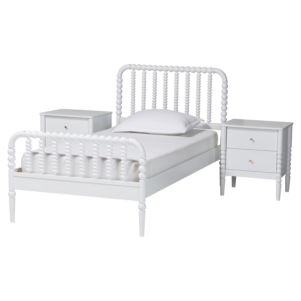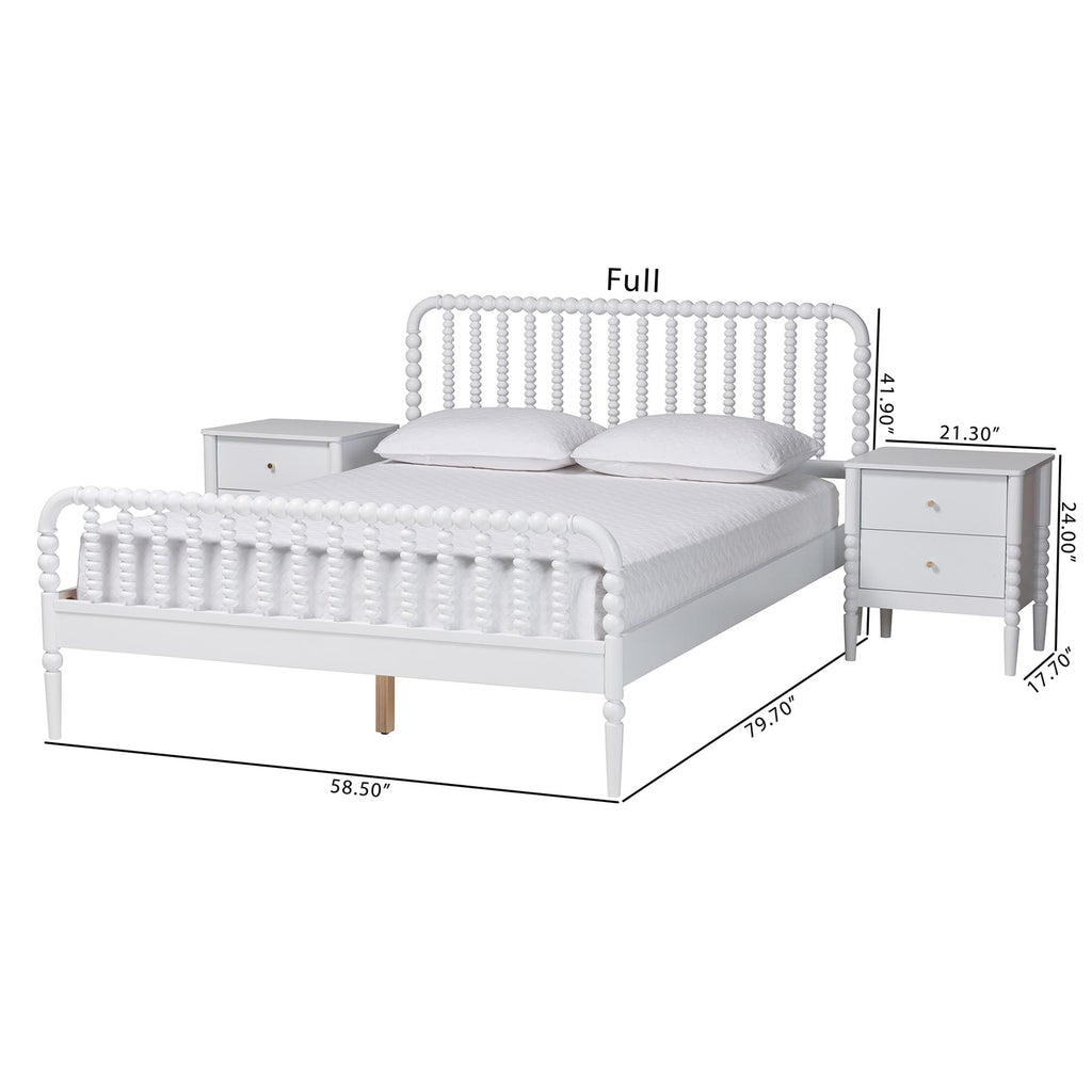 Mid-Century Set Includes One (1) Platform Bed and Two (2) NightstandsConstructed from Rubberwood and Engineered WoodTurned bobbin design rich with traditional charmSlatted wood headboard and accent footboardMinimalist metal drawer pulls add a glamorous touchNo Box Spring Required: Wood slats eliminate the need for a box springAssembly Required?: