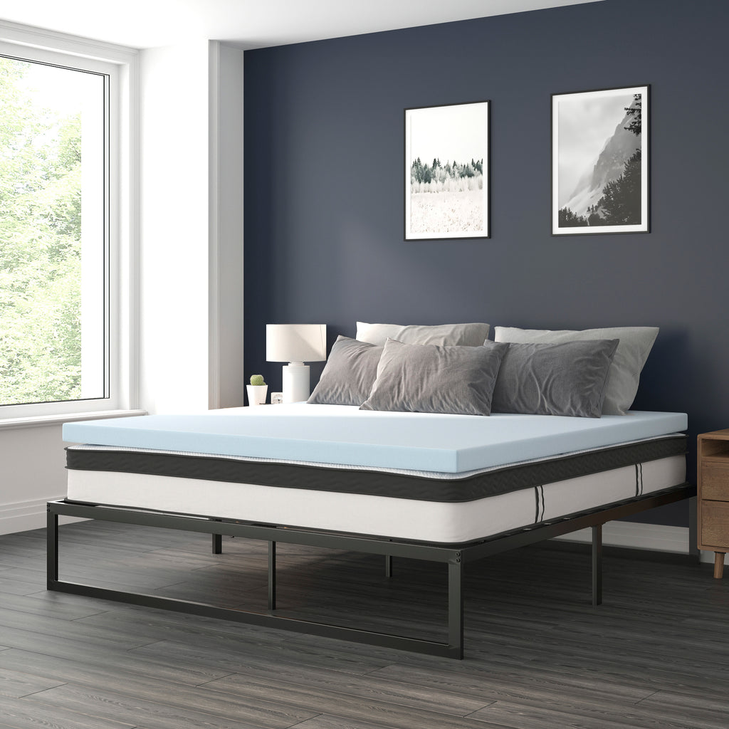 14 Inch Metal Platform Bed Frame with 10 Inch Pocket Spring Mattress in a Box and 2 Inch Cool Gel Memory Foam Topper