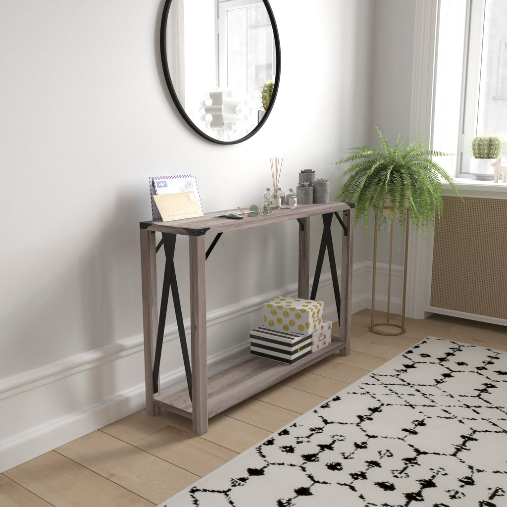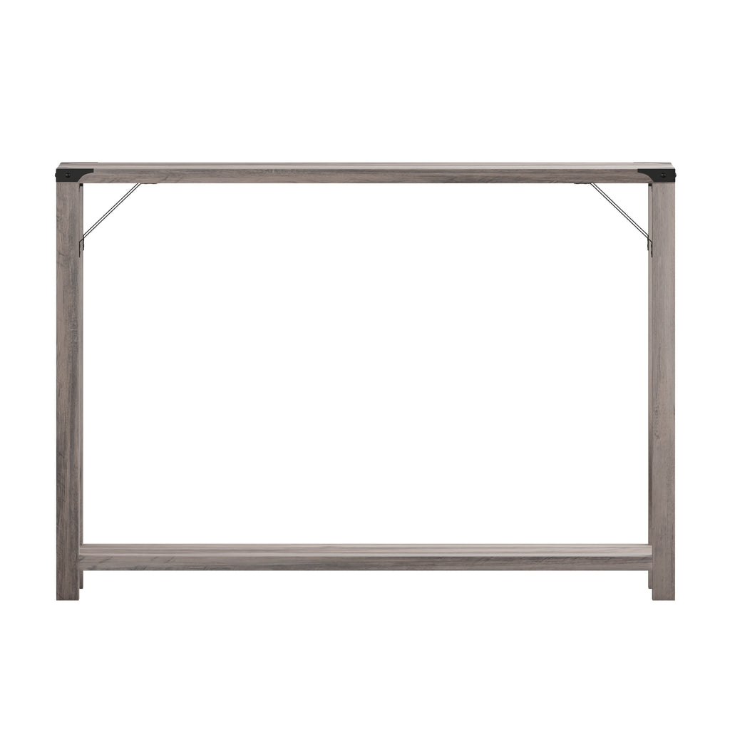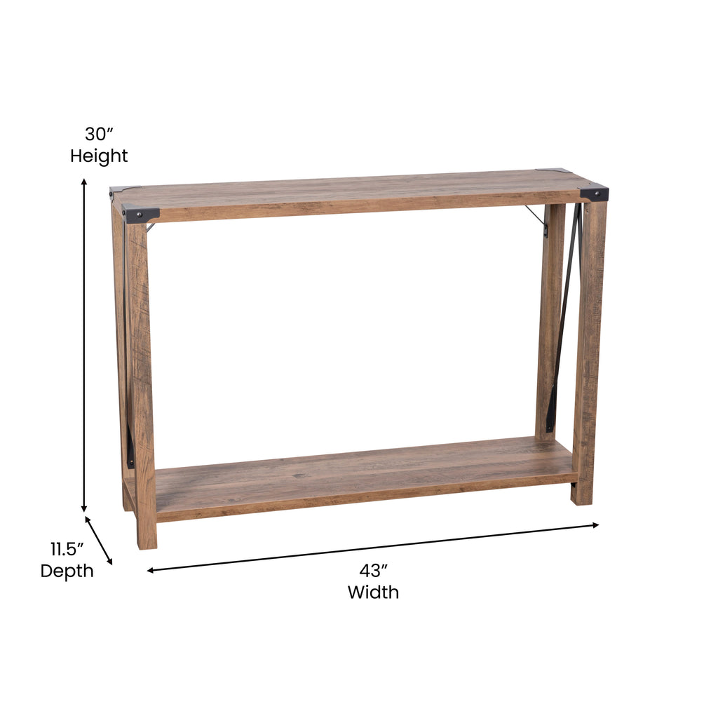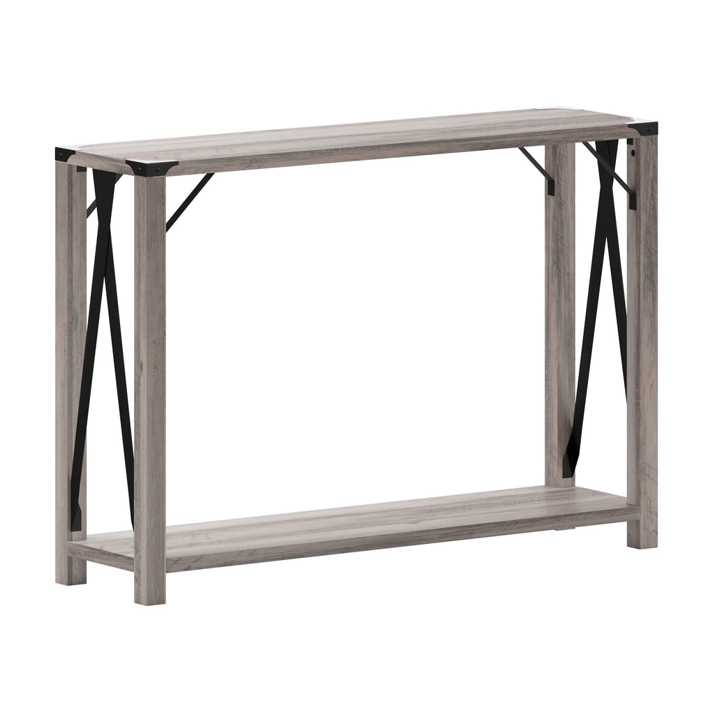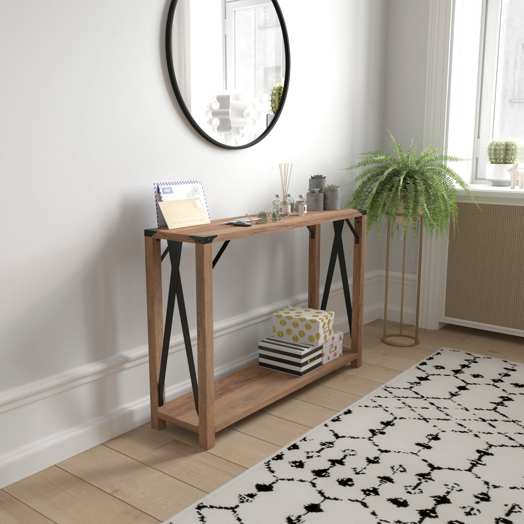 Wyatt Modern Farmhouse Wooden 2 Tier Console Entry Table with Metal Corner Accents and Cross Bracing